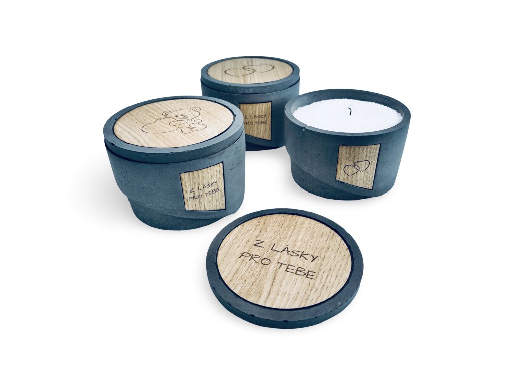Valentýnská sypaná svíčka v betonu "Tedy" 450g - vesmírně šedá/dub